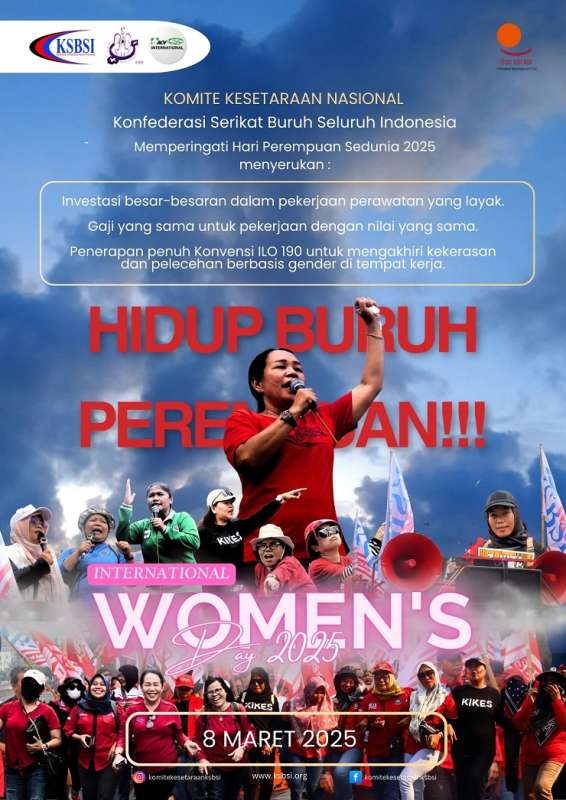 Seperti diketahui, serikat buruh dunia atau International Trade Union Confederation (ITUC) bersama konfederasi afiliasi salah satunya KSBSI, menyerukan dan mendukung Demokrasi yang mewujudkan keadilan sosial dan kesejahteraan bagi semua melalui kesetaraan gender yang tinggi. Di bulan ini, mereka meningkatkan tuntutan untuk hak-hak perempuan, termasuk hak-hak serikat pekerja yang lebih kuat bagi perempuan.